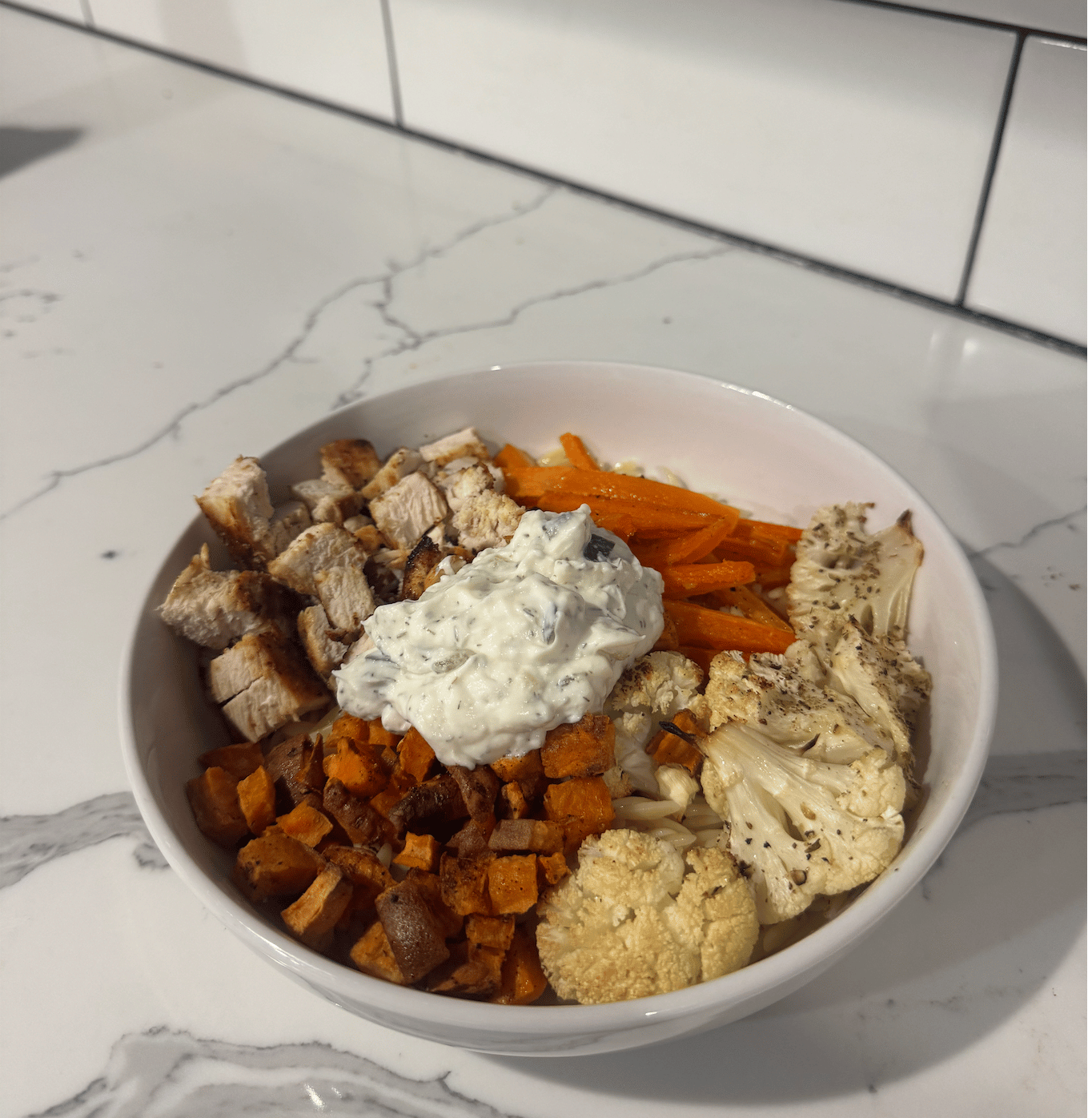 Roasted chicken, cauliflower, sweet potatoes and carrots over orzo with tzatziki